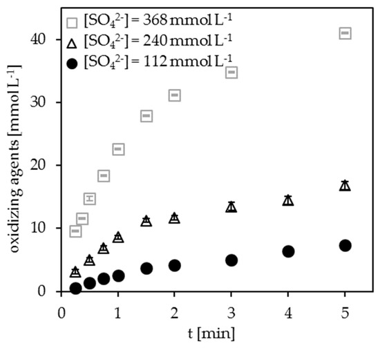 To quantify the produced amount of secondary oxidants, which can significantly support the DOC decomposition, the total amount of measurable oxidants was analyzed. Here, only metastable oxidants, such as hydrogen peroxide or peroxodisulfate, can be detected. Short-lived substances, such as •OH radicals and SO4−• radicals, are no longer present at sampling after electrolysis at the analyzer outlet. As shown in Figure 5, the production of more stable oxidants increases with increasing concentrations of sulfate. After a certain time, the oxidizing agent concentration reaches a concentration plateau because the rate of the generation of oxidizing agents equates the rate of their cathodic decomposition. Additional measurements show that only 0.4% of the oxidizing agents is H2O2 and 99.6% is peroxodisulfate.
