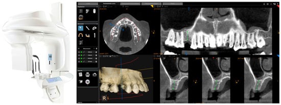 This scan was performed in orthodontic mode, and consisted of a scan of the master model (site of the edentulism), of the antagonist, and of the capture of the bite (occlusion). During the scan, the operator took care to capture every morphological detail of the teeth adjacent to the implant, i.e., those selected to support the future surgical guide. At the same time, special attention was paid to the scanning of soft tissues in the area of edentulism. The files thus acquired were saved in .STL format in a special folder. In the same session, the patient was then subjected to 3D radiological examination with cone beam computed tomography (CBCT), using a powerful scanner with adjustable field-of-view (CS 9300®, Carestream Dental, Atlanta, GA, USA) (Figure 2).