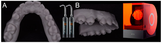 The models are printed in resin (Invicta917®) with a desktop stereolithographic (SLA) 3D printer (XFAB2000®, DWS, Thiene, Italy). (A) Occlusal view. (B) Lateral view.
