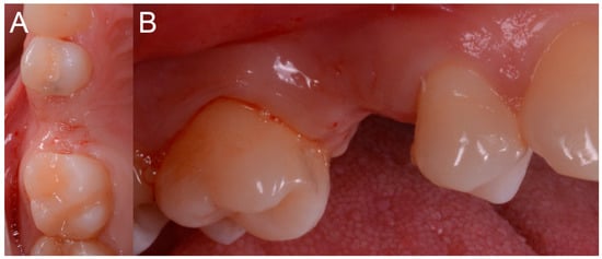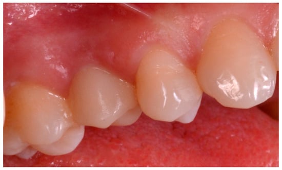 The individual customized abutment was designed to be cemented on a titanium abutment (BT link® BTK, Dueville, Vicenza, Italy), screwed on the implant. The individual customized abutment was milled in zirconia with a powerful 5-axis milling machine (DWX-50®, Roland, Ascoli Piceno, Italy), sintered in an oven (Tabeo®, Mihm-Vogt, Stutensee, Germany), and cemented extra-orally on the titanium base. The provisional crown, however, was produced by milling PMMA with a 4-axis milling machine (DWX-4®, Roland, Ascoli Piceno, Italy). After the extra-oral cementation, the individual hybrid (titanium/zirconia) abutment was positioned and screwed onto the implant. The PMMA provisional restoration was finally cemented on it with a zinc-oxide eugenol cement (TempBond®, Kerr, Orange, CA, USA) (Figure 13).
