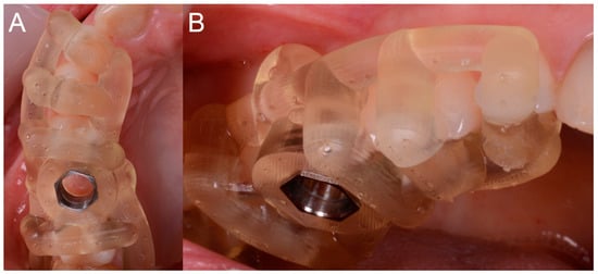 The surgical guide in position with the sleeve inserted in. (A) Occlusal view. (B) Lateral view.
