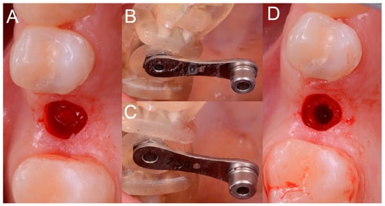 Different phases of surgery. (A) Mucotomy; (B,C) Preparation of the implant bed with different reducers inserted in the sleeve. (D) Occlusal view during preparation of the implant bed.