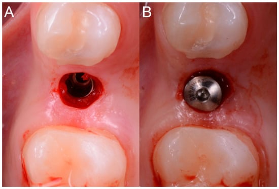 Implant positioning. (A) The implant (BT Safe Bone Level, BTK, Dueville, Italy) is inserted through the guide, in the planned position, inclination and depth; (B) The healing abutment is positioned.
