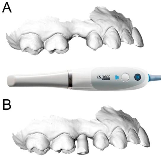Optical impression with CS 3600® (Carestream Dental, Atlanta, GA, USA). (A) Without scanbody. (B) With scanbody.