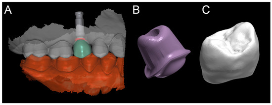 Computer assisted design project (EXOCAD®, Darmstadt, Germany). (A) CAD scene. (B) Details of the individual zirconia abutment (upper portion of the hybrid abutment); and (C) PMMA crown.
