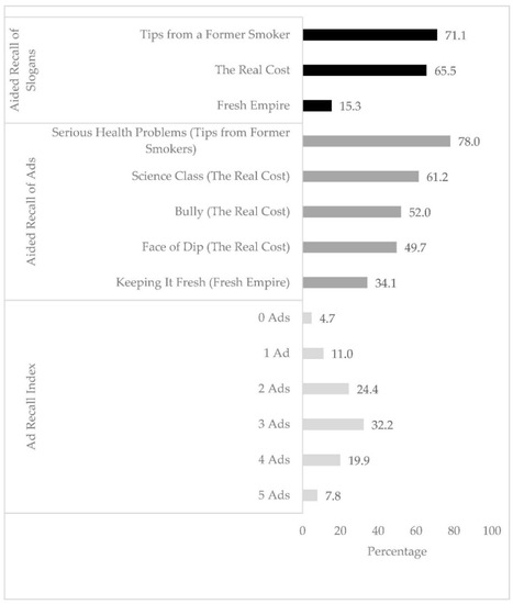 - Kranzler, E.C.; Gibson, L.A.; Hornik, R.C. Recall of “the real cost” anti-smoking campaign is specifically associated with endorsement of campaign-targeted beliefs. J. Health Commun. 2017, 22, 818–828. [Google Scholar] [CrossRef] [PubMed]