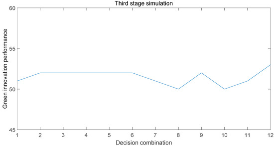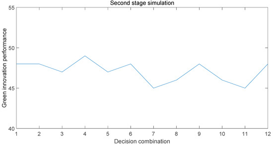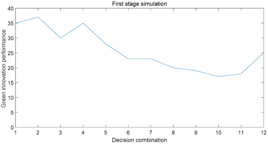 According to the simulation results of MATLAB, the initial assignment of the first stage has the influence of 12 different selection combinations on the green innovation performance. It is found that the second combination can make the innovation performance reach the optimal value, as shown in Figure 2. The Collaborative Innovation Center is at the initial stage of development. Although China strongly supports green technology innovation, it is more important for the upgrading of environmental pollution control technology based on the ecological environment. In response to the key points of the problem, combined with the needs of stakeholders, we can better solve the problem of people and nature. Therefore, when the Collaborative Innovation Center is established, the center should take the university research as the core. First, to quickly identify the problem and the direction of improvement in the future, the center should explore the key issues of pollution. Then, strong connections should be established between the main bodies to strengthen communication and facilitate the rapid transmission of information. In this way, the realities of all of the aspects of the pollution problem can be grasped with the least cost, so that the problem can be quickly analyzed, and more solutions can be proposed for selection. At the same time, trust is used as the relationship governance mechanism. In the condition of mutual trust, each main body can be made to have a sense of identity and enhance the cohesiveness of the collaborative innovation network.