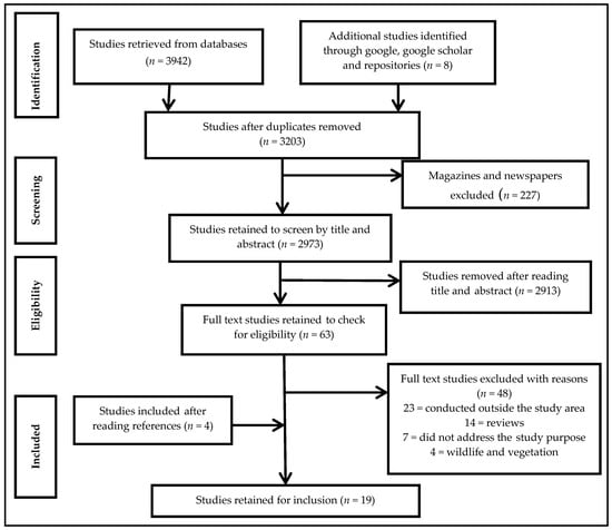 We report our findings within the confines of the Preferred Reporting Items for Systematic Reviews and Meta-Analyses (PRISMA) guidelines []. Our search yielded 3950 studies. Our criteria excluded duplicates (n = 747) and magazines, and newspapers (n = 227). Screening of titles and abstracts excluded 2913 studies. The full texts of the remaining 63 studies were retrieved and read for eligibility and relevance, which led to a further exclusion of 48 studies. Fifteen remaining studies (n = 15) met our inclusion criteria. Reference lists of studies retained were screened and yielded four (n = 4) more studies, resulting in a total of 19 studies included in this systematic review (Figure 1).
