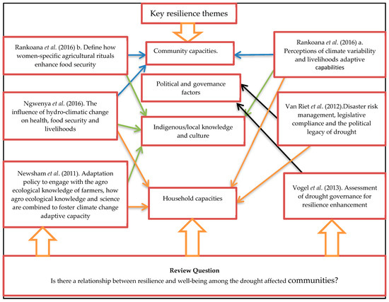 There are gaps in the research on how resilience to droughts relates to the well-being of rural subsistence communities. The gaps are perpetuated by the lack of adequate contextual resilience measures to inform resilience policies and interventions. Generating evidence to bridge this gap has the potential to mitigate the negative impact of droughts on rural communities and help them recover in the most rapid and sustainable way. In addition, it will enable governments and humanitarian and development agencies to reduce expenditure on repetitive and costly drought interventions. The evidence will also inform the implementation of the United Nation’s Sustainable Development Goals (SDGs) in the region, specifically those that address poverty (SDG1), hunger (SDG2), and health and well-being (SDG3) []. Therefore the purpose of this study is to assess the relationship between resilience to drought and well-being; and to identify gaps where further research is needed to inform a standard and contextual measure of resilience. However, resilience has been conceptualised differently and there is no single definition, hence, it was important to assess the suitability of the instruments used to measure resilience.