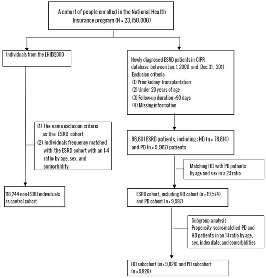We identified 90,353 patients with newly diagnosed ESRD (ICD-9-CM 585 and were registered in the CIPR database) from 1 January 2000 to 31 December 2011. After excluding patients who were under 20 years of age, and those who had an OSA history (ICD-9-CM 327.2, 780.51, 780.53, 780.57), kidney transplantation, or a follow-up period of less than 90 days, we enrolled 88,801 ESRD patients, including 78,814 HD and 9987 PD (including continuous ambulatory peritoneal dialysis and automated peritoneal dialysis) patients. Next, we divided them by matching HD with PD patients by age and sex in a 2:1 ratio and generated an ESRD cohort including a HD cohort consisting of 19,574 patients and a PD cohort with 9987 patients. We selected 118,244 individuals in the database who did not have a history of CKD or ESRD (ICD-9-CM 580-589) as the non-ESRD control cohort matched with the ESRD cohort by age, sex, and index-year in a 1:4 ratio (Figure 1). In addition, we did a subgroup analysis in which 9826 HD patients were further propensity score (PS)-matched with PD patients at a 1:1 ratio by age, sex, index date, and comorbidities as the HD subcohort to balance the baseline characteristics between PD and HD patients. The index date was defined as the date when patients applied to the CIPR for ESRD. Underlying comorbidities that could affect outcome such as coronary artery disease (CAD; ICD-9-CM 410 to 414), diabetes (ICD-9-CM 250), stroke (ICD-9-CM 430-438), hyperlipidemia (ICD-9-CM 272), chronic obstructive pulmonary disease (COPD; ICD-9-CM 490-496), hypertension (ICD-9-CM 401-405), congestive heart failure (CHF; ICD-9-CM 428), and obesity (ICD-9-CM 278) were used to generate predicted disease probability using logistic regression.