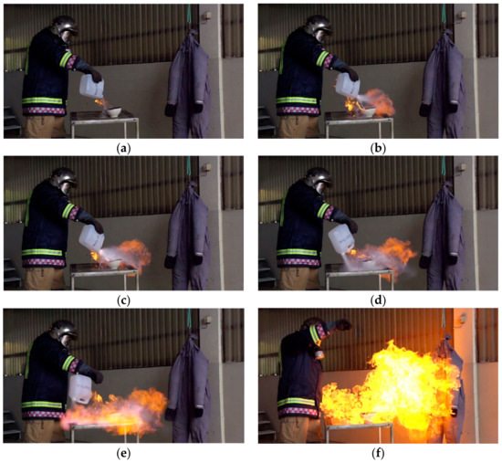 Demonstration of a 4 L ethanol container gas phase igniting at room temperature. The time sequence is about 0.5 s, i.e. (a) t = 0.1 s, (b) t = 0.2 s, (c) t = 0.3 s, (d) t = 0.4 s, (e) t = 0.5 s, (f) t = 0.6 s. (The Norwegian Directorate for Civil Protection (DSB) [32], reproduced with permission.).