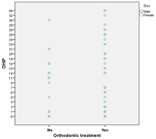 The OHIP values showed no statistically significant difference between genders (p = 0.693). Likewise, the orthodontic treatment did not seem to affect the OHIP-values (Figure 1), as no statistical difference was found between “orthodontically treated” and “non-orthodontically treated” participants (p = 0.29).