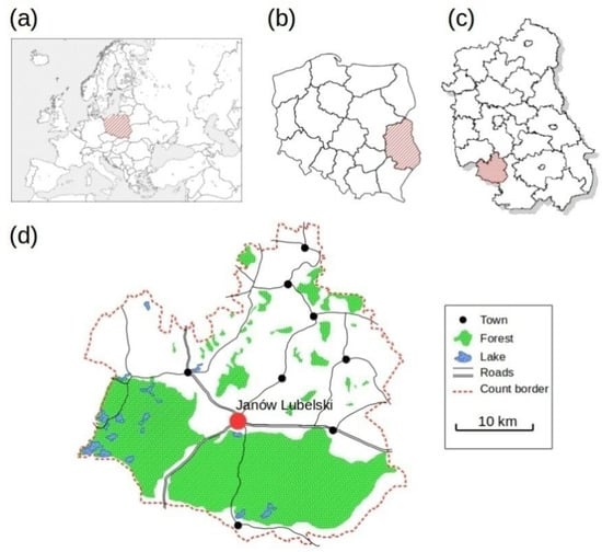 Figure 1. Approximate residential locations of participants, Janów district, Poland. (a) Europe; (b) Poland; (c) Lubelskie Voivodeship; (d) Janów district.