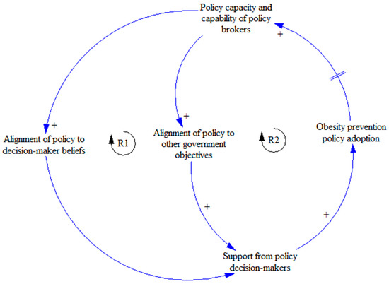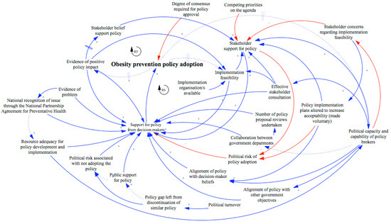 This study investigated the policy process involved in the adoption of the Achievement Program as part of the HTV obesity prevention initiative. By utilising multiple theories, the study uncovered a number of key influences on obesity prevention policy decision-making, including the problem prioritisation at the Federal and then state government level; the political risks regarding policy action and inaction, and framing used by policy advocates to reduce risks and highlight the opportunities related to the Achievement Program policy implementation. This study found that both the MST and ACF were useful theoretical frameworks for unpacking policy processes, however the ACF analysis required strengthening through the incorporation of the institutional factors set out in the IADF. The use of CLD methods was advantageous to further conceptualise potential leverage points and effective ways to influence obesity prevention policy in future. Based on the findings of this study, recommended actions for policy actors seeking to increase future obesity prevention policy action in similar contexts include consideration of the policy implementation requirements early in the policy development process; identification of potential policy development risks, and development of corresponding risk management strategies (e.g., undertaking well-managed consultations and negotiations); and adapting policy framing to align with broader government objectives and dominant belief systems.