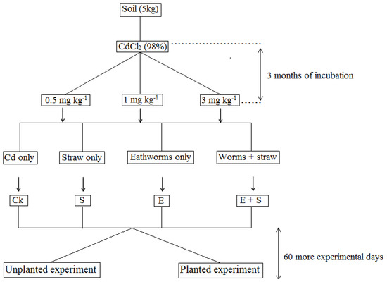 After 3 months of incubation, the prepared and inoculated pots with Cd were used for the experiment and they were either left unplanted or planted for 60 more experimental days. Each experimental type has four treatments with three replicates including the control treatment (Ck) with neither rice straw nor earthworms; S treatment with rice straw only; E treatment with earthworms only and E+S treatment with both earthworms and rice straw (Figure 1). Ground straw (to 2 mm particle size, 500 g/kg soil) was applied on the soil surface of the S and E + S treatments; the soil matrix was thoroughly mixed and then moistened with deionized water up to 70% of the water holding capacity. For each species of earthworms, 10 adults and healthy individuals worms with similar fresh weight (1.84 ± 0.06 g and 3.03 ± 0.04 g for E. fetida and A. caliginosa, respectively) were randomly selected, regrouped and rinsed with deionized water and placed on moist paper for 24 h to void the gut content before placement on the corresponding soil surface of E and E + S treatments. The initial body weight of earthworms was measured immediately before placing the animals on the pot experiment. After 60-days, the final body weight was taken for body weight evaluation. The mortality of earthworms in the pre-incubation treatment was monitored every 5 days. Earthworms were considered dead when they did not show any response on probing.