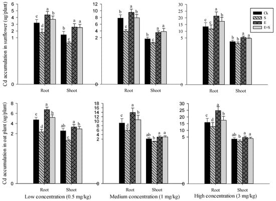 Effect of earthworms (E) and rice straw (S) on sunflower and oat plant root and shoot Cd accumulation under different Cd concentrations (low, 0.5 (1) medium, 1 (2) and high, 3 (3) mg/kg Cd) treatments after 60 exposure days. Different colors (Black, grey, tan…) vertical band present the mean of three replicate and were compared by Tukey’s tests. The lowercase letters in the same group (four vertical bands) indicates significant difference at p < 0.05.