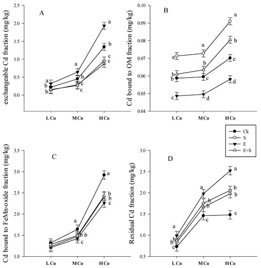 Effect of earthworms (E) and rice straw (S) on Cd fraction extracted in unplanted different soil divided into exchangeable (A), bound to organic matter (B), bound to iron-manganese oxide (C) and residual fraction (D) under different Cd concentration (L Co (low concentration), 0.5 M Co (medium concentration), 1 and H Co (high concentration), 3 mg/kg Cd) treatments after 60 exposure days. Different colored points (Black, grey, tan…) present the mean of three replicate and were compared by Tukey’s tests. The lowercase letters in the same group (4 points) indicates significant difference at p < 0.001.