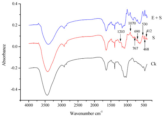 FT-IR in 4000–400 cm−1 spectra region of rice straw. Ck indicates the spectra of rice straw untreated (natural); S, that of RS in soil and E + S the spectra of RS in soil inoculated with earthworms.
