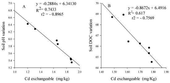 Linear regression performed to set up the correlation between Cd availability and soil pH (A) and soil DOC (B) variation.