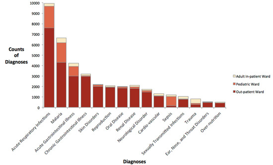 The most common diagnoses for the out-patient ward, the pediatric ward, and for all wards combined were acute respiratory infection, followed by malaria, and acute gastrointestinal illness (Figure 2). For the adult in-patient ward, the three most common diagnoses were malaria, trauma, and acute gastrointestinal illness.