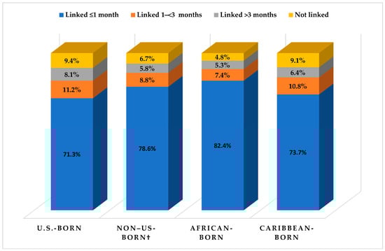 African-born blacks accounted for the higher percentage of persons linked to care in ≤1 month after diagnosis and the lowest percentage not linked to care, compared with Caribbean-born blacks. African-born blacks were more likely to receive a diagnosis and have no differences in late-stage HIV diagnosis, compared with Caribbean-born blacks, according to previous studies [11]. African-born blacks with diagnosed HIV were more likely to be female (60.7% versus 44.7%) and aged 25–44 years (63.3% versus 47.7%) than Caribbean-born blacks [11]; thus, they might be more likely to have healthcare access primarily for seeking pregnancy– and child-bearing–related care. Previous studies indicated a substantially higher proportion of African-born black women who received pregnancy care, compared with Caribbean-born black women. For example, 39% of women who became pregnant after receiving an HIV diagnosis in Rhode Island (USA) during 2004–2009 had been born in Africa, compared with only 3% who had been born in the Caribbean [22]. Another multisite longitudinal study that compared U.S.-born and non-U.S.-born black mothers with HIV infection reported that 23% of HIV-exposed infants had been born to non-U.S.-born black mothers, of whom 65% were African-born, compared with 25% of mothers who had been born in the Caribbean [23].