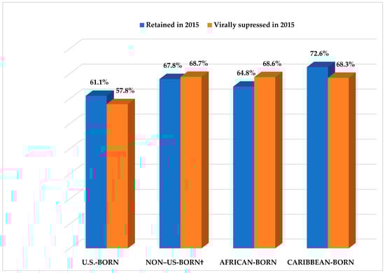 Retention and viral suppression during 2015 among blacks aged ≥13 years with HIV infection diagnosed during 2014 and who were alive as of December 31, 2015, by place of birth, National HIV Surveillance System, 40 U.S. areas. † Includes African- and Caribbean-born blacks.