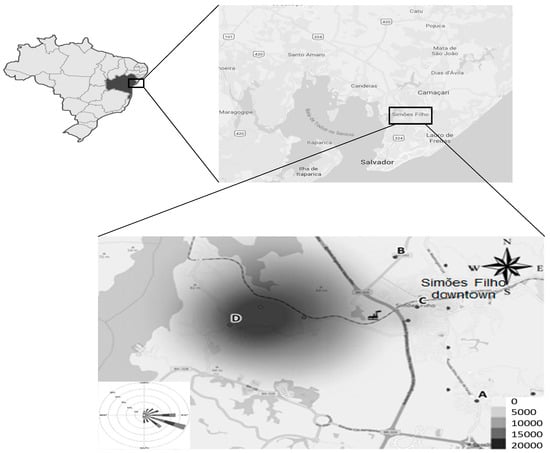 A cross-sectional study was carried out in the municipality of Simões Filho, located in the metropolitan region of Salvador, Bahia, Brazil. The town, which is located on the edge of the main highway reaching the state capital, is exposed to diverse atmospheric pollution emitted by cement, petrochemical, and shipyard related activities and particularly affected by the ferro-manganese alloy plant [34], located approximately 2 km from the urban center (Figure 1). Four elementary schools were selected in this municipality, based on their distance to the alloy plant and the levels of Mn deposition rate in dust reported in our previous publication [34]. Children’s inclusion criteria were: living in the region for at least one year, aged 7 to 12 years, and attending one of the selected schools. The non-inclusion criteria were history of neurological disorders or psychiatric follow-up. Recruitment was done in the selected schools, after the principal provided us with the lists of registered students in each school level. We sent out invitations to parents or caregivers inviting them to attend meetings, where we explained the objectives and study procedures. The parents or caregivers signed a free and informed consent form authorizing the participation of their children in the investigation. The children also provided a written consent agreeing to participate as volunteers. This study protocol was approved by the Federal University of Bahia Research Ethics Committee (No. 874.463/2014).