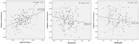 The model B summarizes these coefficients after maternal IQ scores were entered. It shows that LogPbB β-coefficients are practically unaffected (β = −8.61, p = 0.004). Mn biomarkers are no longer significantly associated with child IQ. The model’s statistics are improved significantly; the correlation coefficient (r2) changes from 0.167 to 0.316, and the F-value changed from 6.00 to 13.88. Figure 2 presents the residual plots of children’s IQ scores for each of the significant covariates. Maternal IQ responds for 20.1% of the variance of the child IQ, followed by age (2.7%) and LogPbB levels for 3.4% of the variance.