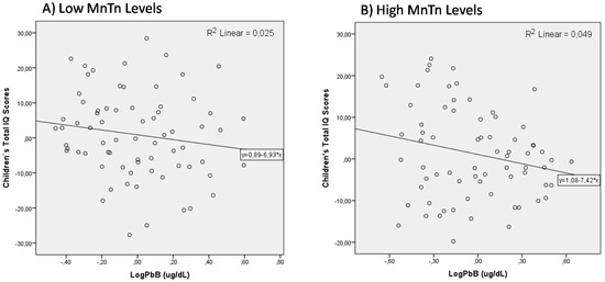 The effect of Mn co-exposure on the association of PbB on children’s intellectual performance was evaluated initially as an interaction. The coefficients in Model C show that the interaction terms are not significantly associated with children’s total IQ scores. However, when we tested effect modification by dichotomizing children’s Mn exposure measured by MnTn levels (Low MnTn vs. High MnTn, median 0.84 µg/g), we observed a significant change on the association of children’s PbB and their IQ scores. Data from Model D show that for children with low MnTn, the non-standardized β-coefficient for LogPbB (β = −6.80) is no longer significant (p = 0.172). The model’s F-value is decreased to 5.90 and the correlation coefficient is decreased to r2 = 0.256. On the other hand, when we run the model for children with high MnTn (Model E), the non-standardized β-coefficient for LogPbB is −8.70 (p = 0.036). The model’s F-value is 12.38 and explains 38.1% of the variance with the same number of participants (n = 74). The scatter plots of adjusted relation between IQ and the concurrent blood Pb concentrations in the high and low level Mn groups are shown in Figure 3a,b, respectively.