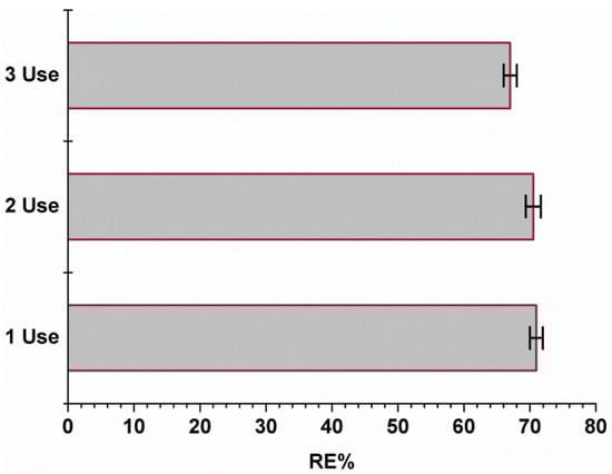 Bisphenol A removal efficiency, RE%, during regeneration and reuse of FF. Experimental conditions: fiber loading = 1 g; water volume = 50 mL; C0 = 15 mg/L; pH = 5; contact time = 60 min.