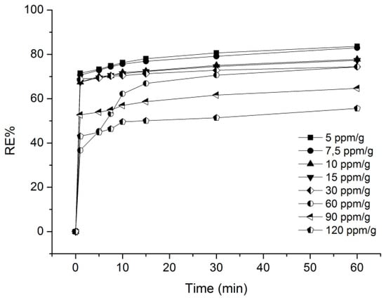 Alternatively, data were reported in terms of removal efficiency (RE%), defined as the following Equation (2):