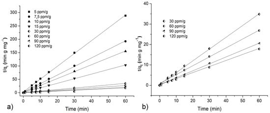 (a) Fitting of the experimental data by the pseudo-second order kinetics model. Experimental conditions: water volume = 50 mL; pH = 5. (b) Magnification of the data from 30 ppm/g to 120 ppm/g for a better visibility of the fitting. The errors in the t/qt evaluations are in the range from 0.09 to 0.72%.