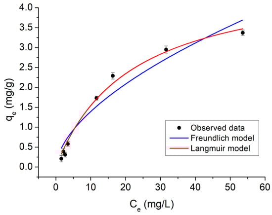 where KF is the Freundlich adsorption constant, related to the surface heterogeneity. Figure 7 shows that the fitting curve (blue line) obtained with the Freundlich model (R2 = 0.935), to which correspond the following fitting parameters: KF = (0.4 ± 0.1) Ln/g mg(n−1) and n = (1.72 ± 0.23).