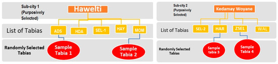 In selecting the sample respondents, then, four tabias (two tabias from each sub cities) were randomly selected using simple random sampling method. Accordingly, a sample household is selected using a systematic random sampling technique with a sampling interval of 6 and the household heads were automatically selected as a study sample. According to probabilities proportional to the size technique the sample size was distributed by each tabias. The list of households obtained from the sub-city administration in the selected tabias was used as a sampling frame. Figure 2 presents the sampling procedure used in the study.