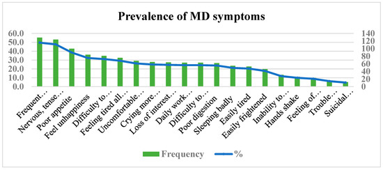 Prevalence of mental distress (MD) symptoms among study participants in Mekelle city, Tigrai, Ethiopia.