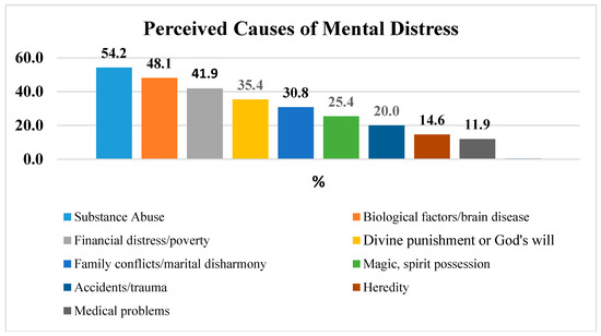 This study revealed that more than half of the study participants (141:54.2%) expressed the view that substance abuse or misuse could cause MD. The second most commonly endorsed cause of MD was found to be biological factor or brain disease (125:48.1%) and financial distress or poverty was reported as the third most commonly cause of MD. Divine punishment or God’s will was reported by 92:35.4% of the study participant as a cause of MD. This finding was somehow in line with the findings of study conducted in Karifi Vilage, Nigeria. The study reported misuse of drugs as the most commonly endorsed cause of MD followed by divine punishment/God’s will and magic or sprit possession [17].