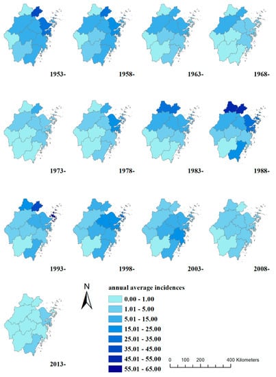SPSS (version 16.0, IBM Inc., Chicago, IL, USA) was employed for Spearman’s rank correlation. All results were considered statistically significant if p < 0.05 for both sides. ArcGIS software (version 10.1, ESRI Inc.; Redlands, CA, USA) was used to for mapping incidences.