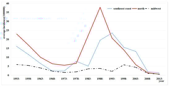 The Patriotic Health Campaign launched by the government at the beginning of the foundation of the People’s Republican of China helped reduce the incidence of all kinds of diseases and significantly improved public health []. The incidence in 1969 fell to the lowest during the Cultural Revolution, which might be attributed to the fact that all the work in health epidemic prevention stations was stopped and case reports were incomplete. The same was true with Zhejiang Province. The outbreak of chloramphenicol-resistant M1 bacteria in 1988 led to the highest incidence in the history []. In 2004, the China Information System for Diseases Control and Prevention was introduced and disease reporting became more convenient and reliable, which led to an abrupt increase in reporting and a false peak. Thanks to all the preventive measures taken for many years, the incidence was found to be 0.95 per 100,000 population in Zhejiang in 2014, indicating the province as a low-level area of typhoid and paratyphoid.