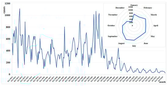 The cases began to increase from April for about six months, with the largest number in July (9485 cases) and August (10,386 cases), and the lower incidence occurred in December (2948 cases) (Figure 5). Three peaks of typhoid and paratyphoid were observed in 1999 and 2003. Two were observed every year from 1991 to 1998 and from 2004 to 2006, with the first one generally being from January to March and the second from May to September. Only one peak from July to September was observed in 2000 and 2001 and every year from 2007 (Figure 5).