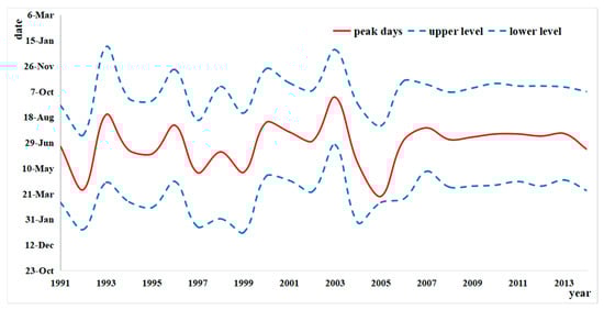 Peak days of typhoid and paratyphoid in Zhejiang from 1991 to 2014 (The peak days, the upper level, and lower level may occur in another year, so the y-axis concludes three years).