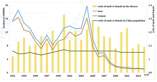 The incidences of diseases in males were higher than in females, and the total male-to-female ratio was 1.16:1, with the high ratios occurring in 2000 (1.33:1), 2005 (1.28:1), and 2006 (1.24:1), and the low ratios in 1991 (1.02:1), 2009 (1.08:1), and 2012 (1.08:1). Expect for 1991, the male-to-female ratios for typhoid and paratyphoid were higher than the male-to-female ratios in China population (Figure 7).