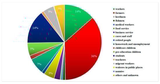 The incidences differed by occupation, with farmers (36%), students (14%), and workers (14%) accounting for more than 50% of all patients (Figure 8). The proportion of farmers gradually declined from 42.44% and remained around 30%, the proportion of workers declined from 15.16% to 10.9%, but pre-education children showed a rising pattern starting in 2004, reaching 13.58% till 2014 (Figure 9).