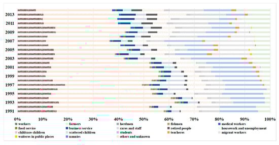 The proportion of different careers in all patients in Zhejiang from 1991 to 2014.