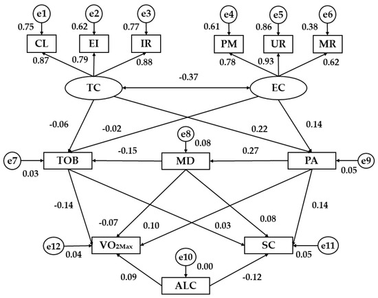 - Chacón-Cuberos, R.; Muros, J.; Cachón-Zagalaz, J.; Zagalaz-Sánchez, M.; Castro-Sánchez, M.; Zurita-Ortega, F. Physical activity, Mediterranean diet, maximal oxygen uptake and motivational climate towards sports in schoolchildren from the province of Granada: A structural equation model. Nutr. Hosp. 2018, 35, 774–781. [Google Scholar] [CrossRef] [PubMed]