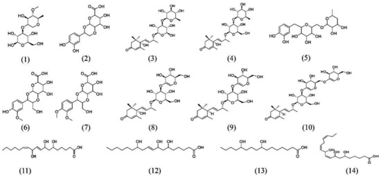 | 8 | 3.24 | (S)-4-((R,E)-3-(((2R,3R,4S,5R,6R)-4-(((2R,3S,4S)-3,4-dihydroxy-2-(hydroxymethyl)-3,4-dihydro-2H-pyran-5-yl)oxy)-3,5-dihydroxy-6-(hydroxymethyl)tetrahydro-2H-pyran-2-yl)oxy)but-1-en-1-yl)-4-hydroxy-3,5,5-trimethylcyclohex-2-en-1-one | 529.2261 | Norsesquiterpenes compound | C25H38O12 | 9285 | 366,457 | 488,103 | -- | 10,581 | 11,959 |