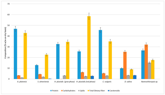 Protein, carbohydrates, lipids, total dietary fiber, and carotenoid compositions expressed as expressed as % w/w on a dry basis ± SD (n = 3) of Arthrospira platensis, Scenedesmusalmeriensis, Haematococcus pluvialis (green phase), Haematococcus pluvialis (red phase), Chlorella vulgaris, Dunaliella salina, Nannochloropsis sp.