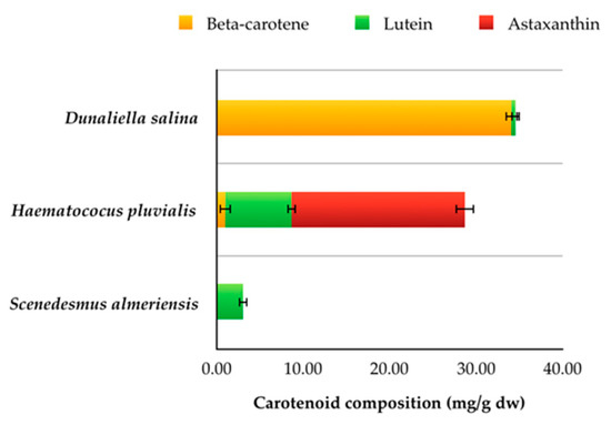 As can be seen in Table 2, D. salina contains the highest percentage of total carotenoids of 3.46 ± 0.15% w/w on a dry basis, whose value is very close to the percentage observed in Garcìa-Gonzalez et al. [48] such as 4% w/w on a dry basis, and higher than the range of values 0.8–2.78% w/w on dry basis reported in other works [49,50]. In H. pluvialis (red phase) total carotenoids constitute 2.87 ± 0.15% w/w on a dry basis, as reported in other works [7,51]. S. almeriensis has a lower content, with 0.30 ± 0.05% w/w on a dry basis of total carotenoids with a capacity to accumulate larger amounts of them up to 1.38% on a dry basis [9]. In addition to the amount of total carotenoids, the composition of individual carotenoids such as beta-carotene, astaxanthin, and lutein, expressed in mg/g on a dry basis, was also investigated (Figure 2).
