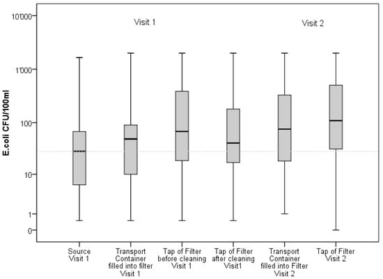 The filling of water from the source into containers and transporting them led to a statistically significant deterioration of water quality (t = −3.09, p = 0.004, r = 0.43 for Log10 transformed counts of E. coli). Counts of E. coli increased from a geometric mean of 22 CFU/100 mL (10–90 Percentile: 1–282 CFU/100 mL) at the source to a geometric mean of 41 CFU/100 mL (10–90 Percentile: 3–456 CFU/100 mL) in the transport container (see Figure 1).