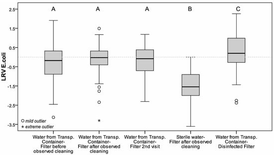 Log removal values of contaminated and disinfected household filters: (A) water from the transport container passed through a contaminated filter; (B) sterile water passed through a contaminated filter and (C) water from the transport container passed through a disinfected filter.