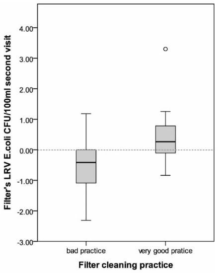 However, variability within different households was high and the household’s filter cleaning practices significantly correlated with the filter’s LRV of E. coli (Pearson’s r = 0.32, p = 0.04). Households that were attributed a very good cleaning categorization achieved a slight improvement in drinking water quality with a mean LRV = 0.4 CFU/100 mL (SD = 0.9). Water in households with a bad practice attribution was further contaminated by the filtration process with LRV= −0.5 CFU/100 mL (SD = 0.8) (see Figure 3).